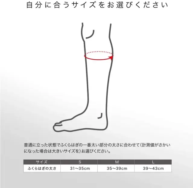 普通に立った状態でふくらはぎの一番太い部分の太さに合わせて(計測値がさかいになった場合は大きいサイズを)お選び下さい。