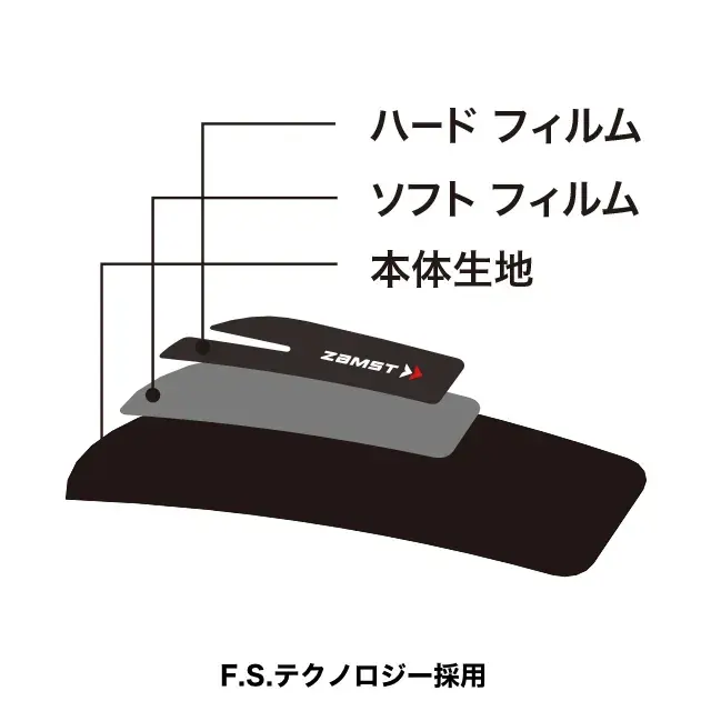 - F.S.テクノロジーを採用(特許技術)。伸縮性の違う2種類のウレタンフィルムを圧着し薄さと強さ、さらには的確なサポート力を実現。※F.S.=Film Stability