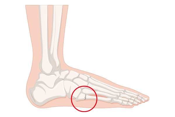 - ジョーンズ骨折は、ランニングやジャンプ動作による過度の体重負荷が、長時間、足部アーチに繰り返し加わることで発生するオーバーユースに起因するスポーツ障害です。金属疲労(金属板の折り曲げ運動)と同様に、繰り返しのストレスが中足骨に加わって起こります。また一般的な骨折とは発生原因が異なり自覚症状が出にくいので、見過ごされることがあります。