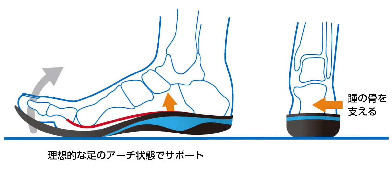 フットクラフトは、踵部分をしっかりホールドして踵を安定させるとともに、つま先が自然に上がりやすい状態をサポートします。これにより足のアーチが強化され、足が最も強い状態とされるウィンドラスメカニズムが発揮されやすくなることが期待できます。