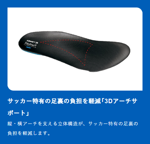 加えて、踵と前足部に厚みを持たせた衝撃吸収構造と、足裏の負担を軽減する3Dアーチサポートを搭載しサッカー特有の足裏の負担を軽減します。サッカーをプレーする方にとって、動きやすさと安心感を両立した理想的な一足です。