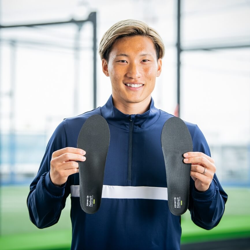 インソールを入れることで力を入れやすくなりますし、切り返しの時にしっかり力を入れて踏ん張れるところもすごく気に入っています。DFは守備の場面ではリアクションで動くことが多く、とっさの動きの時や、ステップを踏んで切り返す時に効果を実感しています。
