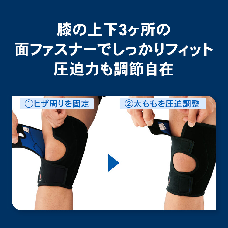 本当に固定力があります。テーピングと同じ機能がこのサポーターに全部入っているぐらい。それに、固定する力が強過ぎず、程よいので動きやすい。着脱もしやすいです。復帰直後は、ヒザに何も付けていないとケガの再発の怖さがあるので、そういう時期に着けるサポーターとしてオススメです。