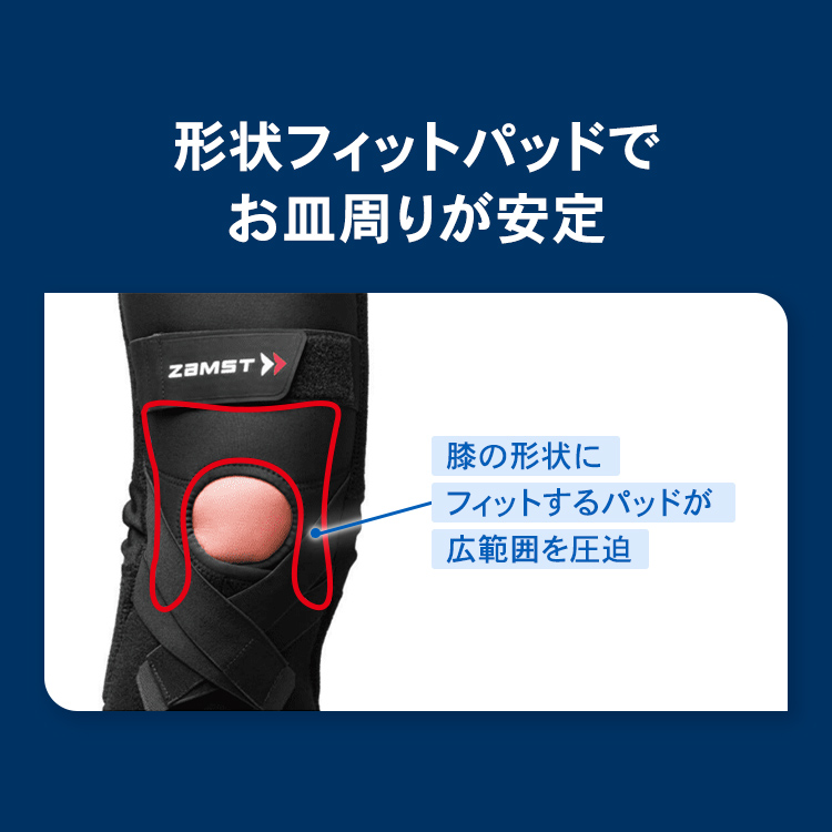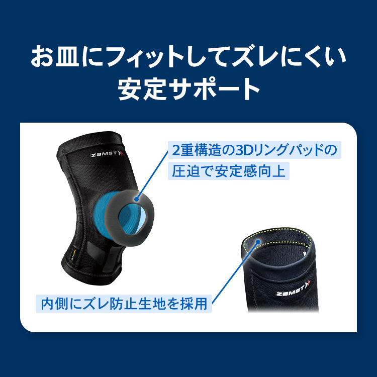 ヒザ用サポーターランキングで1位となったのは、ザムスト ヒザサポーターの中でもっともサポート力が強い「ZK-PROTECT」です。 前方へのぐらつきや左右のブレ、ねじれをしっかり抑え、ケガにつながる動きを効果的に制限します。