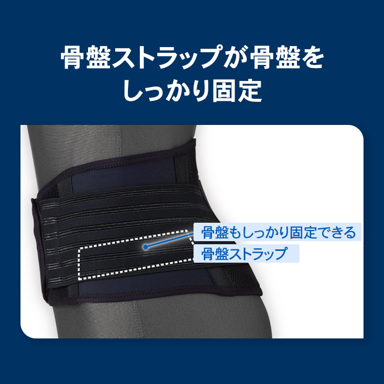 体を前に曲げる、後ろへ反る、横にねじるなどの動きを生み出す腰。腰は5個の骨が積み重なった腰椎と骨盤から構成されています。腰は上半身を支えると同時に、下半身から伝わる衝撃を受け止める役割を持ち、スポーツ時には大きな負担がかかることから、腰痛などを引き起こすおそれがあります。そこでプレー中は腰への負担を軽くして安定させることが重要です。腰用サポーターには主に3つの機能を持っています。