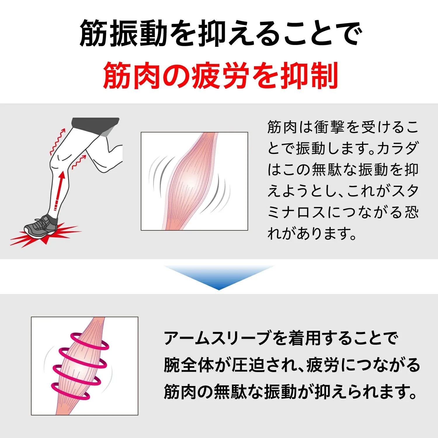スポーツ中の腕やふくらはぎの筋肉は、動作のたびに細かく振動しています。こうした不要な筋肉の揺れは、着地時の衝撃や同じ動作の繰り返しによって生じ、筋肉が無意識にブレーキをかけることでスタミナの消耗につながると考えられています。この“無駄な振動”を抑え、筋肉の働きを効率化するのがコンプレッションスリーブ。適度な圧迫で筋肉をサポートし、疲労の軽減やパフォーマンスの維持に役立ちます。