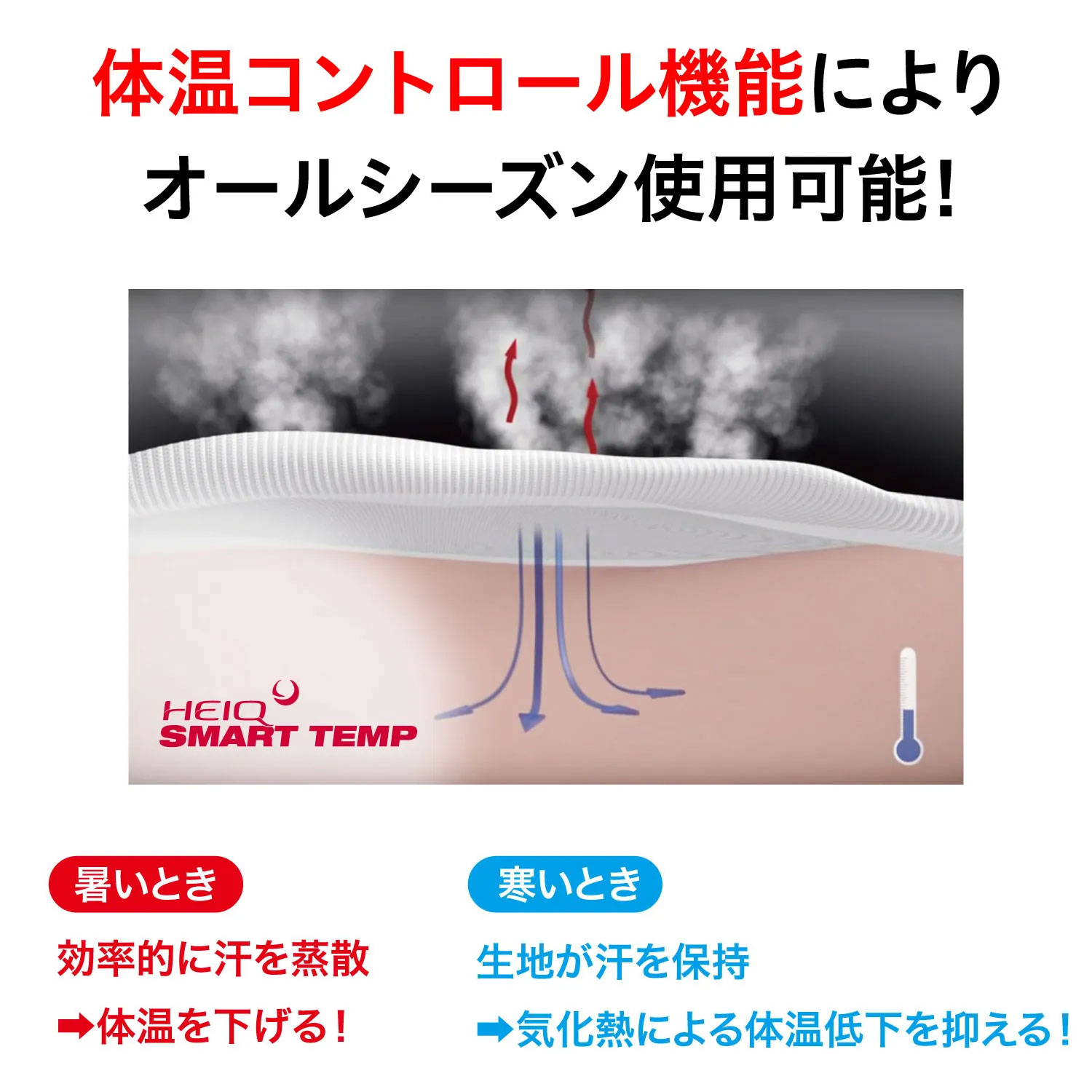 さらに温度調整機能「HeiQ SMART TEMP」により、暑いときは熱を逃がし、寒いときは冷えを抑えて快適さを保ちます。