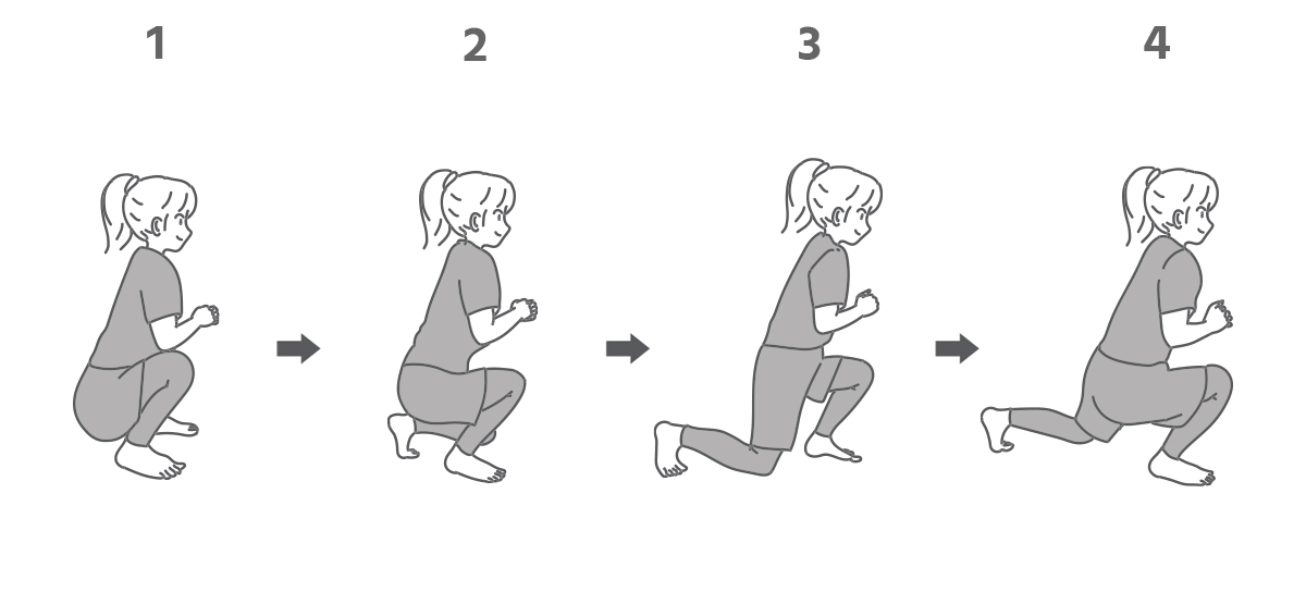 1. 足を開いて深くしゃがみ、背筋を伸ばす