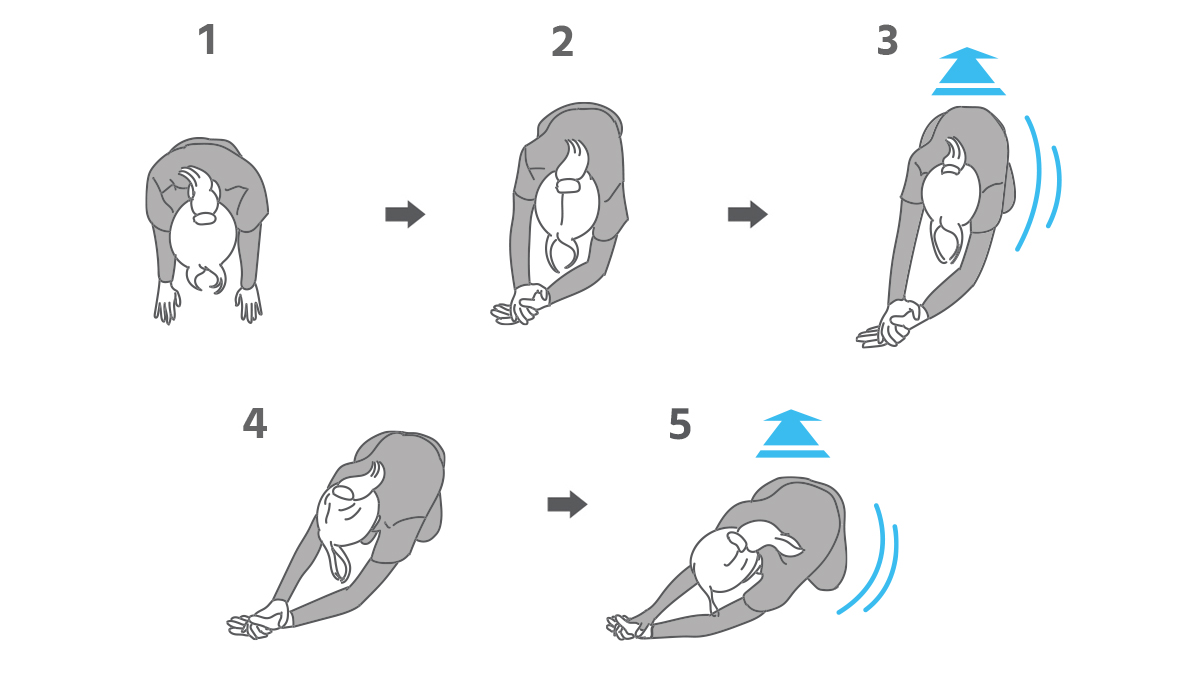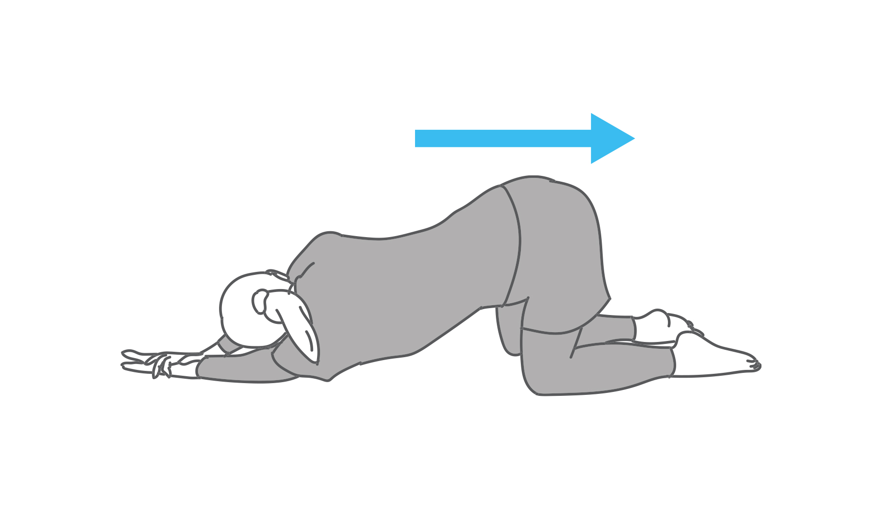 3. 右手で左手の手のひらを軽く押さえた状態で、お尻をゆっくり後方へ引く
