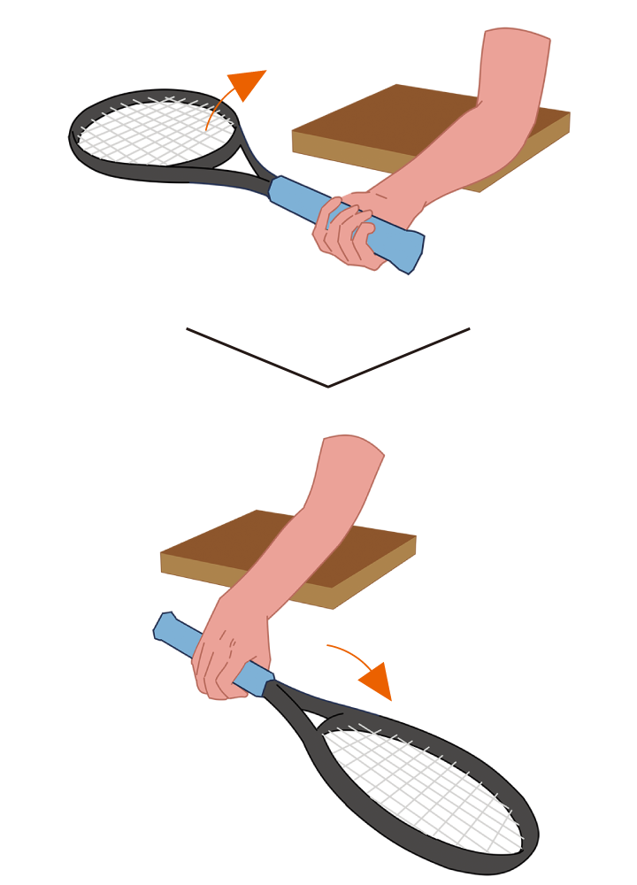 ③再び手のひらが上にくるように、手首をゆっくりと外側に返し、ラケットを外側に動かします。この動きを15回繰り返す動作を2セット行います。